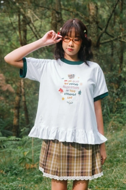 Detail Size 1 : Bust / Lingkar Dada : 102cm Lingkar Ketiak / Armpit: 41cm Shoulder / Lebar Bahu : 12,5cm Sleeve / Panjang Lengan : 18cm Length / Panjang Baju : 58cm Detail Size 2 : Bust / Lingkar Dada : 106cm Lingkar Ketiak / Armpit: 46cm Shoulder / Lebar Bahu : 14cm Sleeve / Panjang Lengan : 20cm Length / Panjang Baju : 60cm Detail Size 3 : Bust / Lingkar Dada : 110cm Lingkar Ketiak / Armpit: 46cm Shoulder / Lebar Bahu : 15cm Sleeve / Panjang Lengan : 22,5cm Length / Panjang Baju : 62cmEnjoy easy, casual styling with the Hanni Short Sleeve, highlighted by a fun color contrast at the neckline. The tee has a great fit that sits perfectly on the body, detailed with a sweet, pleated ruffle along the bottom for an adorable touch. Featuring a lively screen print in the center, it is a great piece to brighten your days with a simple and spirited look.