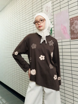 Nina T-shirt hadir dengan warna coklat hangat yang dihiasi motif bunga-bunga unik untuk memberikan sentuhan ceria pada tampilan harian. Atasan lengan panjang ini memiliki detail kerah bulat yang rapi serta potongan bawah asimetris yang memanjang di satu sisi, menciptakan siluet yang dinamis dan tidak kaku. Menggunakan bahan yang lembut dan menyerap keringat, kaos ini sangat nyaman digunakan seharian dan mudah dipadukan dengan bawahan denim maupun celana kulot favorit.